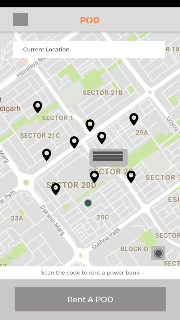 With the insights from exploratory research, POD was conceptualised as a power bank sharing system that helps users find the nearest locations from where they can rent a power bank.