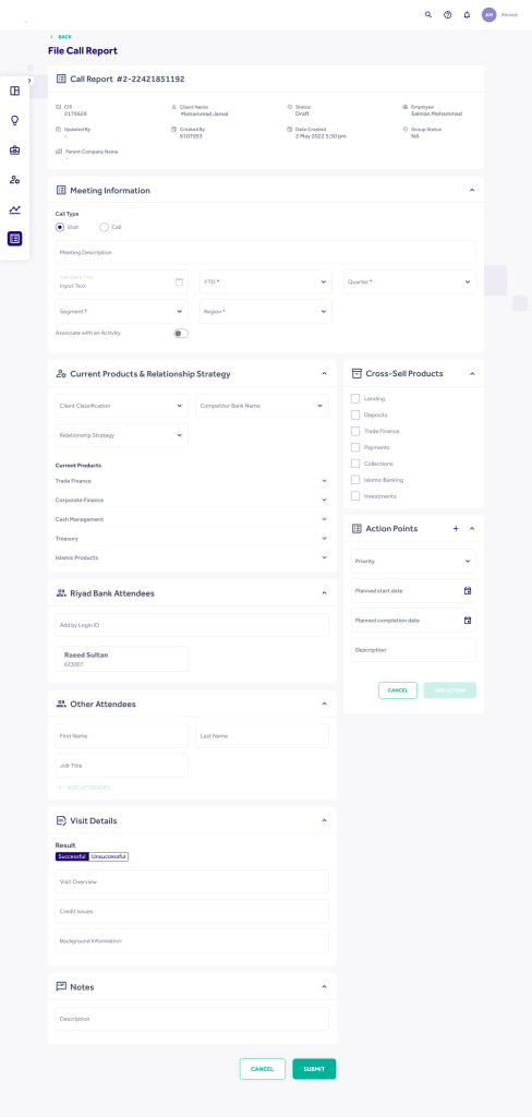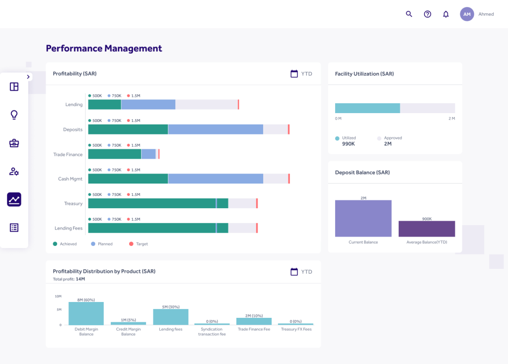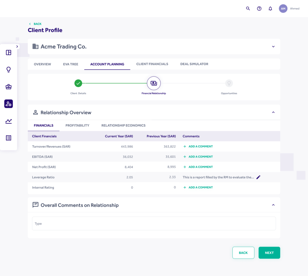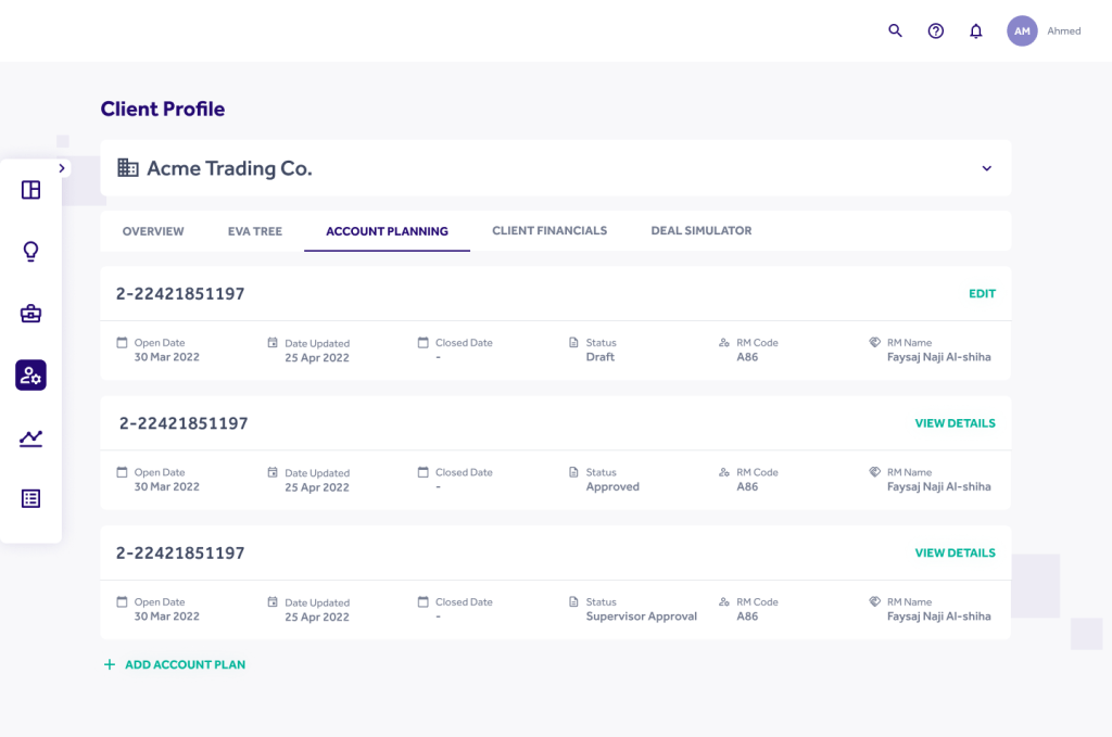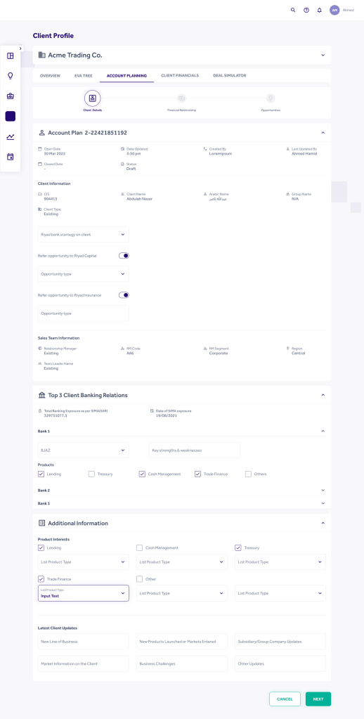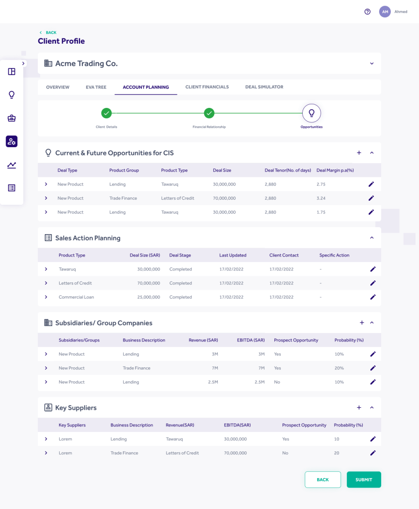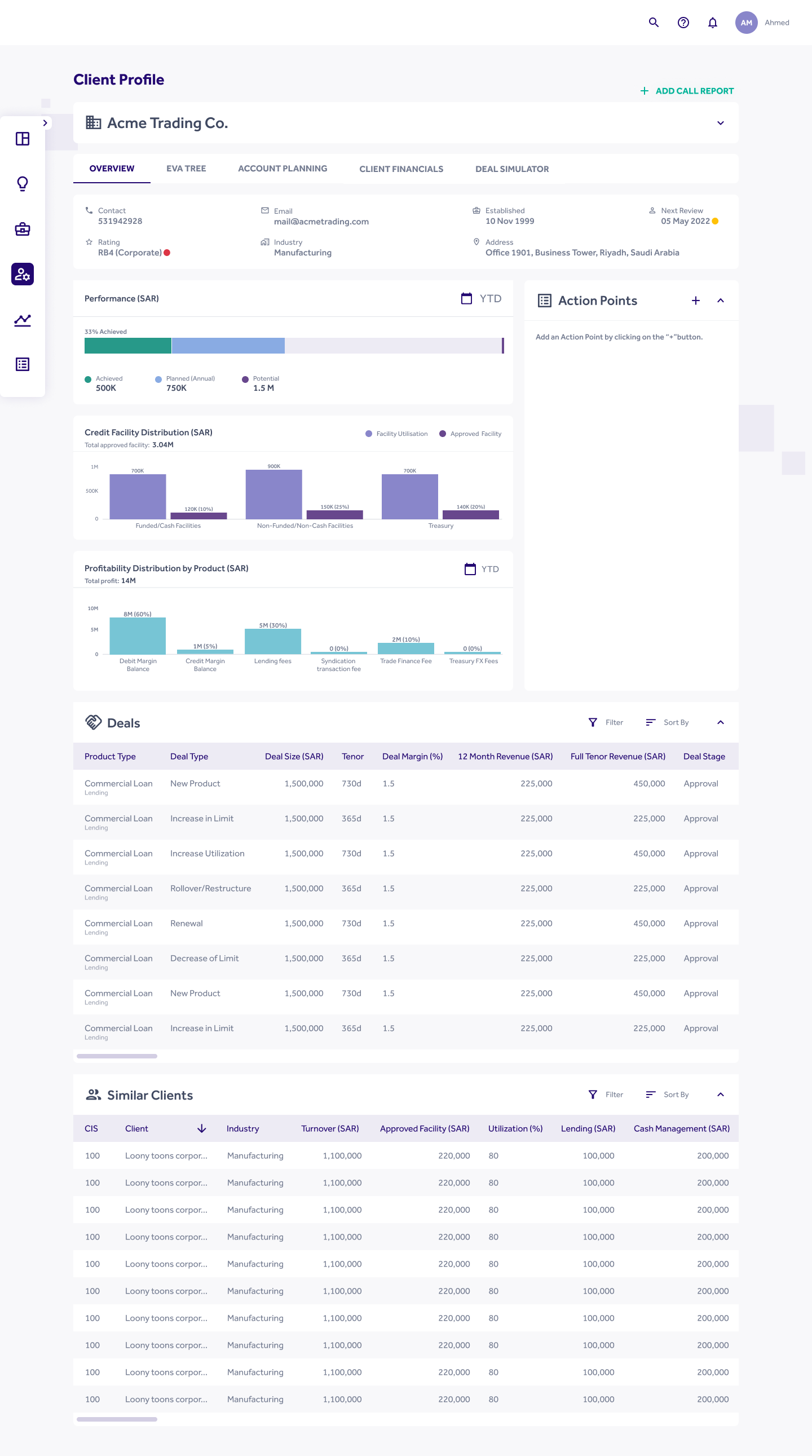 Client profile section provides detailed information for a selected client and also enables RMs to manage the client’s account plan, review client financials and simulate deals on the fly during client visits to identify the best deal for both clients and the bank.
