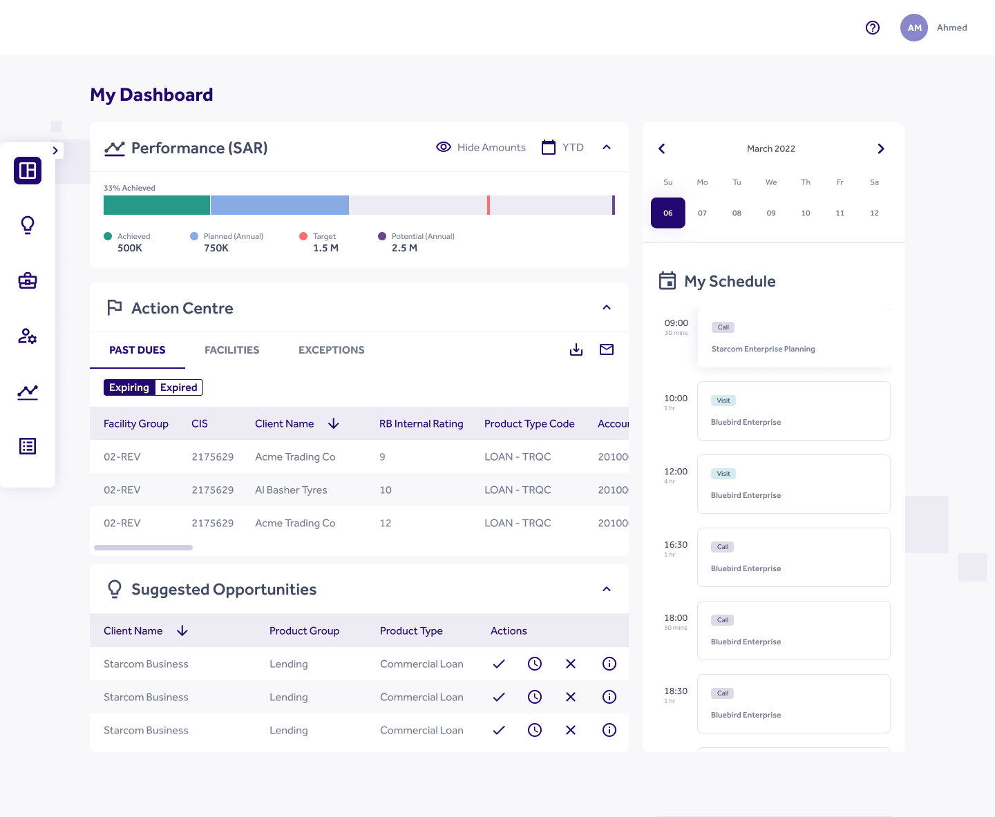 The dashboard provides an RM a quick overview of his/her performance, actions that require immediate attention, their daily schedule and the suggested opportunities from AA (Advanced Analytics) model.