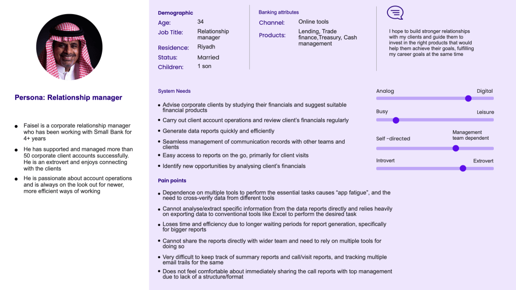 Small Bank wants to create a robust tool for their Corporate Relationship Managers enabling them to manage their schedule better, increase work efficiency and allow access to relevant data quickly to enable better decision making. Design an experience that allows them perform their daily tasks easily.