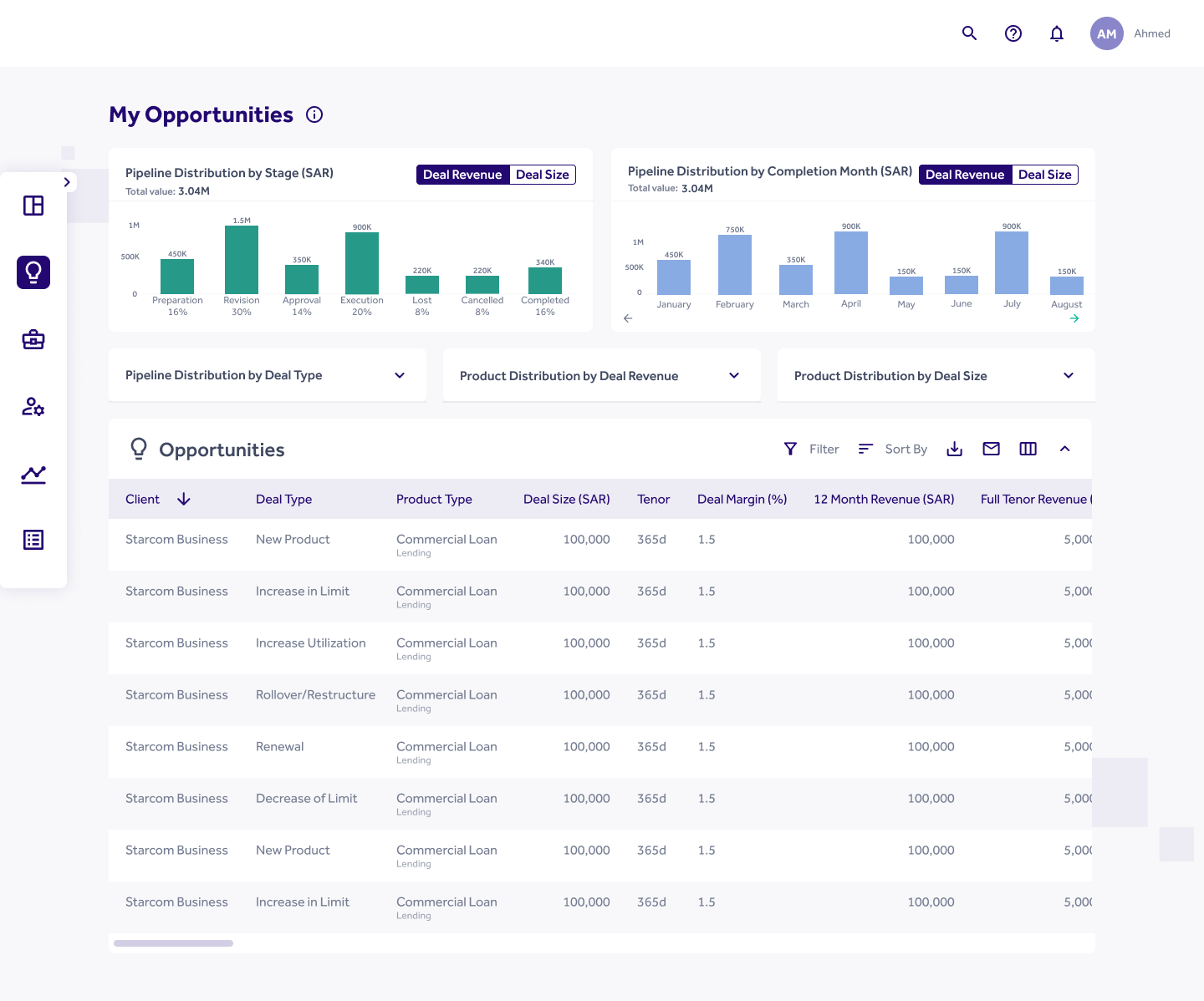 The KPIs on top provide RMs a distribution of how their deals and revenue are performing, allowing them to plan the next steps for their portfolio ahead of time.