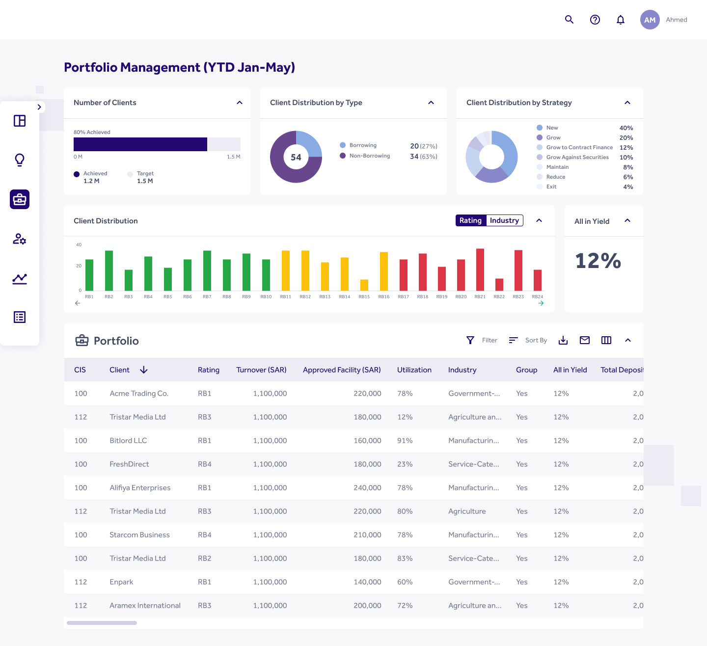 The KPIs on top show the health of an RMs portfolio indicating where the portfolio is lacking and what actions should be taken by RMs to achieve their targets.
