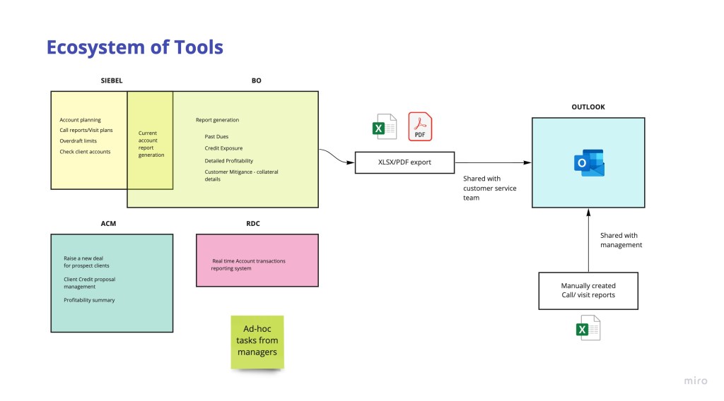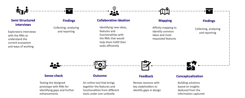 Through a series of interviews with the RMs I was able to understand and map out the ecosystem of tools on which they were dependent to perform their daily tasks. It was clear from the analysis that features offered by these tools were all important independently yet not a single tool could be relied upon for accessing all the relevant information. On the surface level these tools fitted well together as pieces of a jigsaw puzzle but the underlying problems were not addressed.