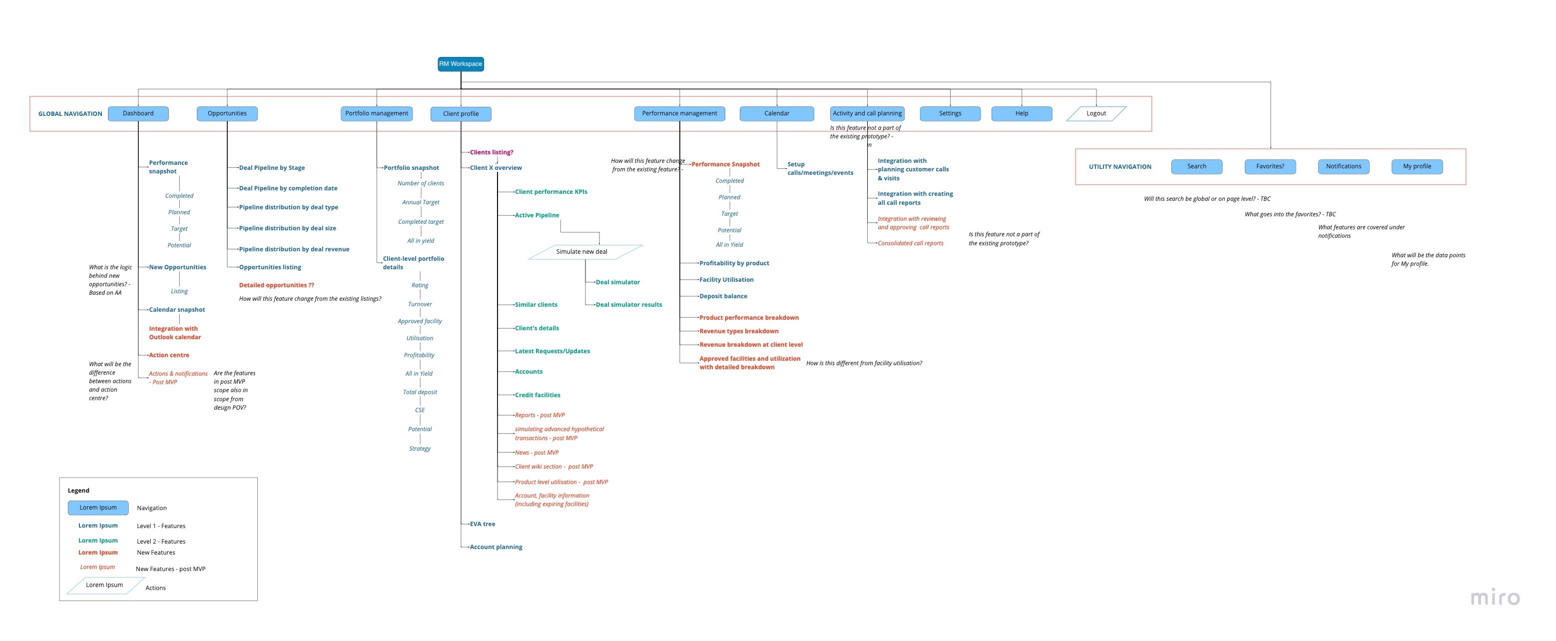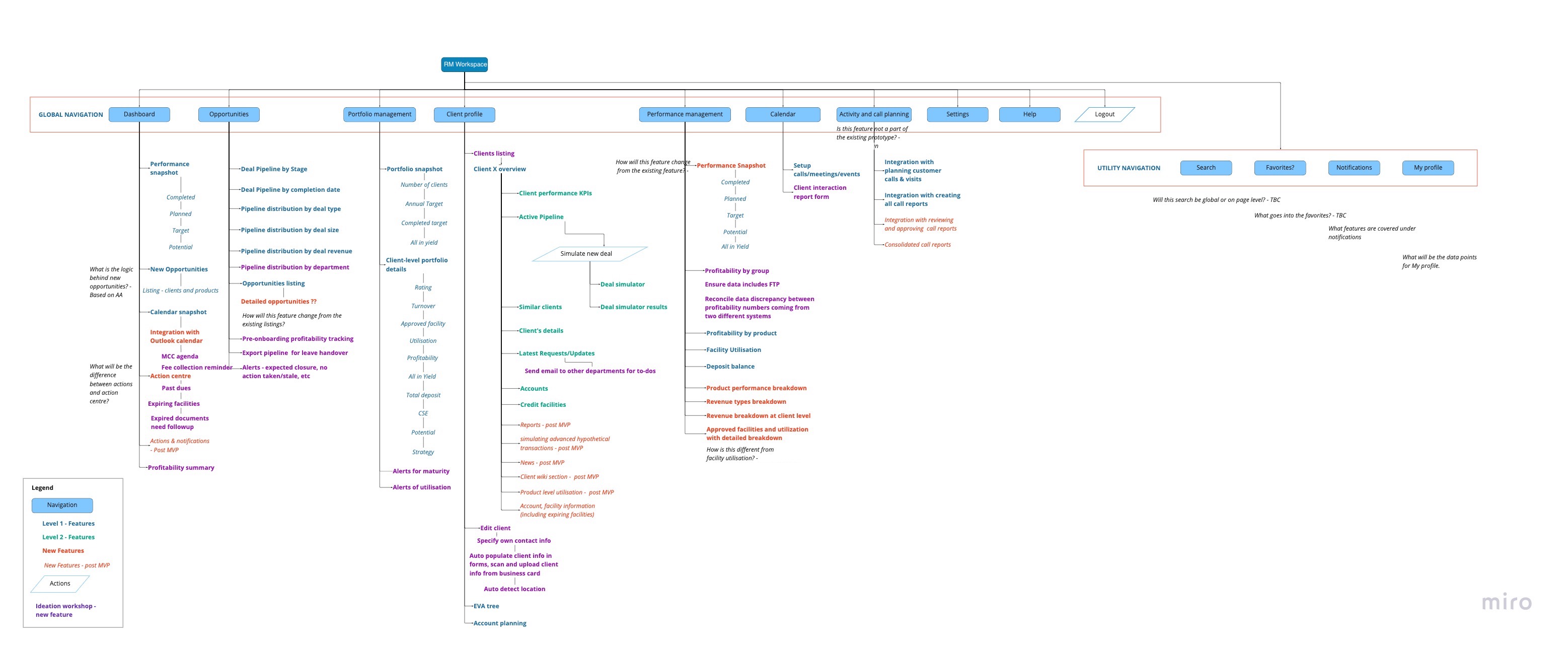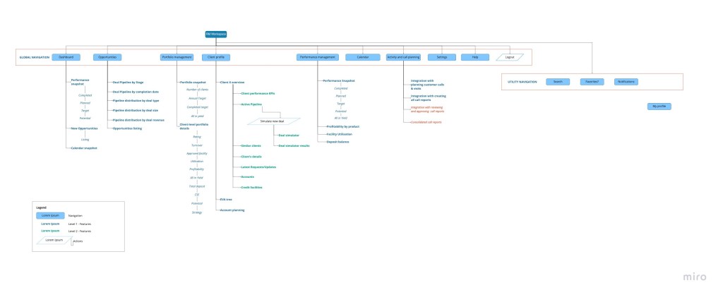 The slideshow below shows how the IA evolved after an initial evaluation of the system and lastly after an ideation workshop with the Relationship Managers.
