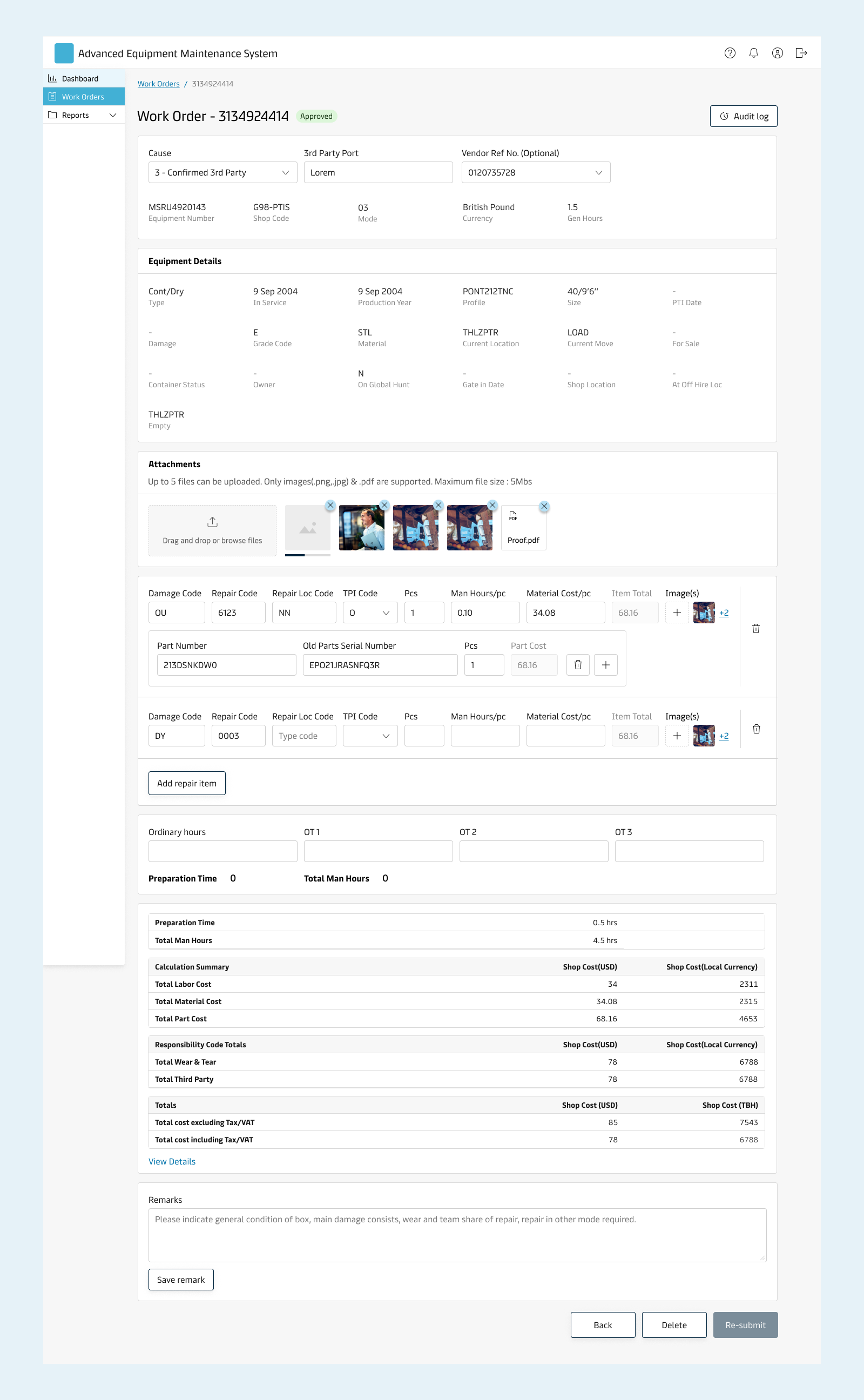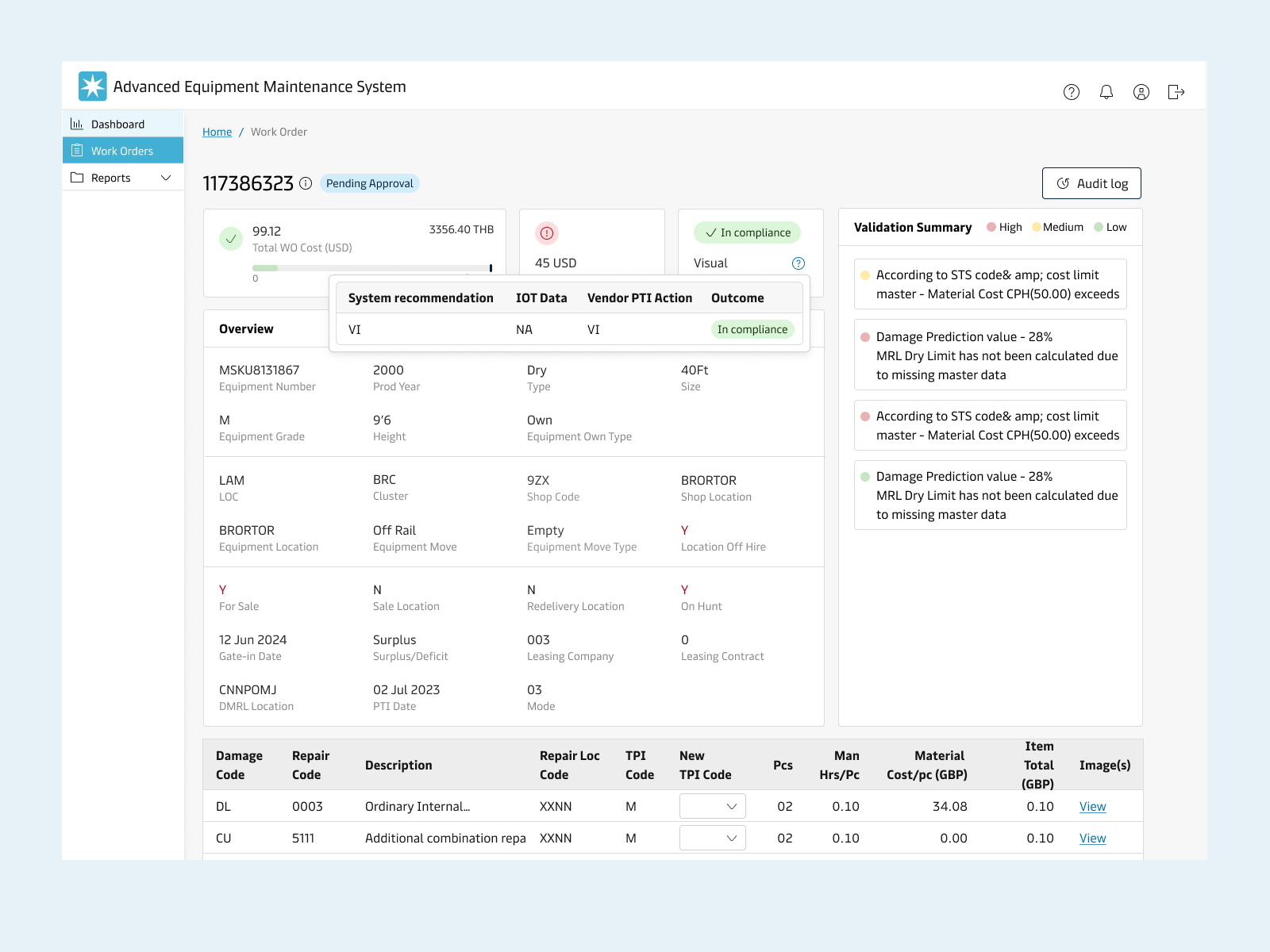 AEMS is an asset management platform which enables equipment repair workflow by serving multiple user groups. The vendors responsible for capturing damages done to the equipment and subsequent repairs can quickly and efficiently create work orders while the business users can review the submitted work orders for repair completion. The EMR (Equipment maintenance & repair) team can regularly audit the vendor performance to evaluate compliance deviation and take relevant actions.