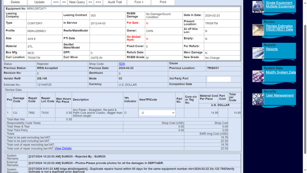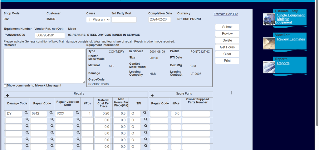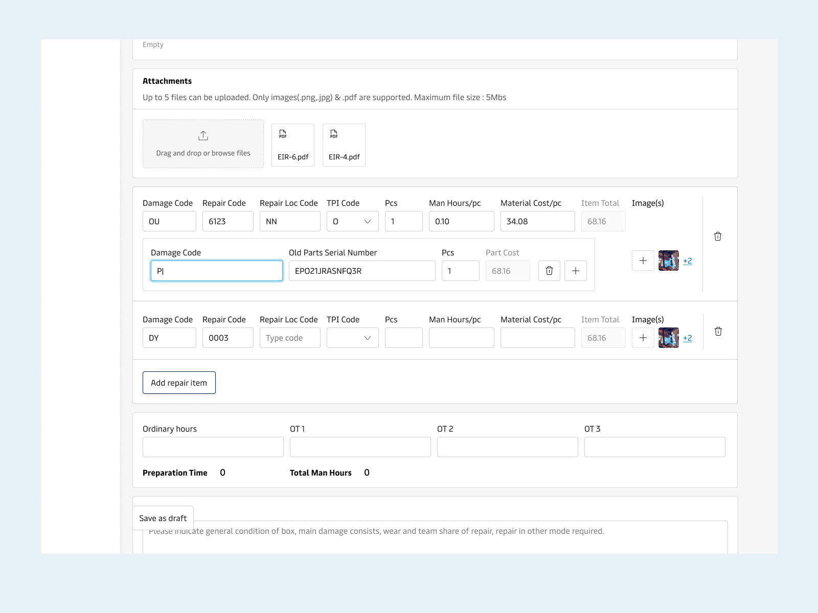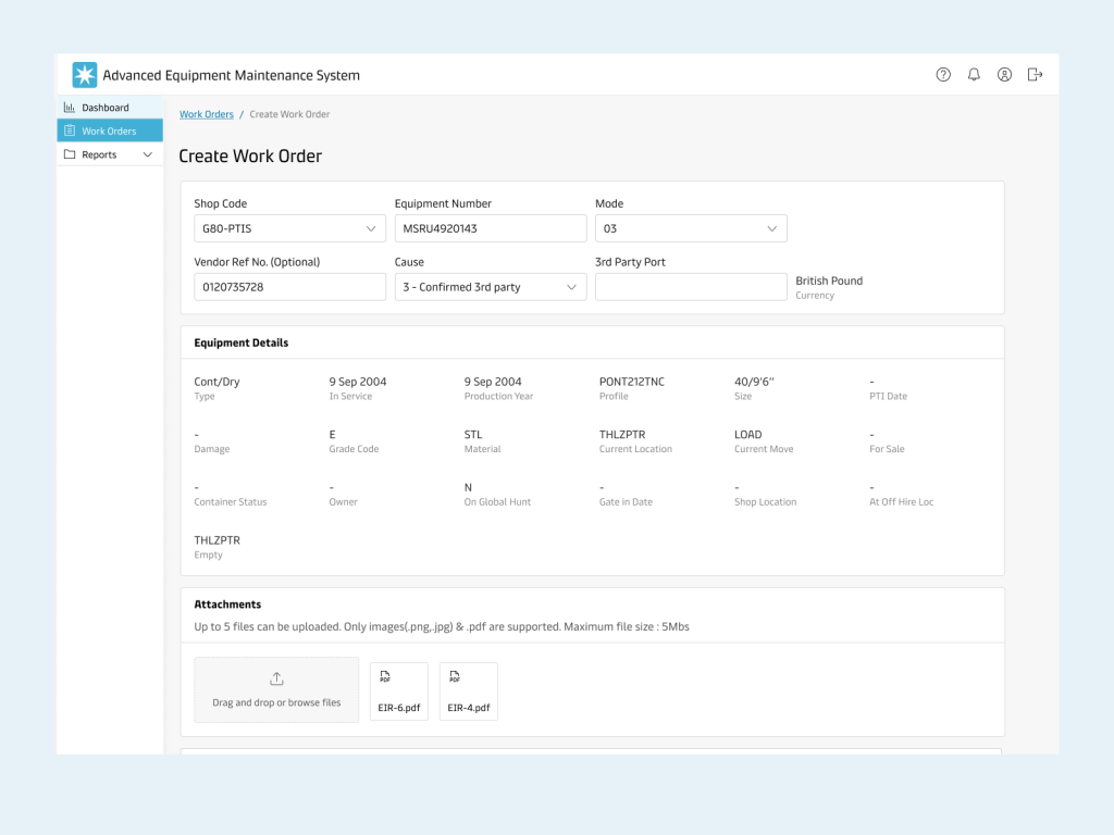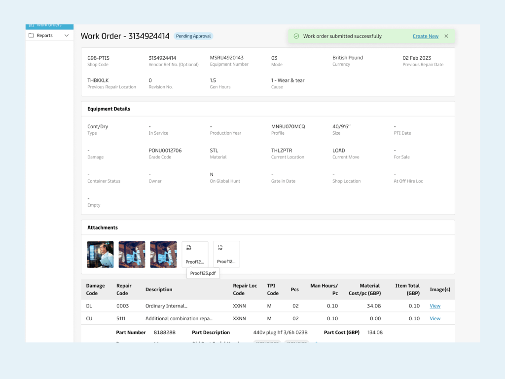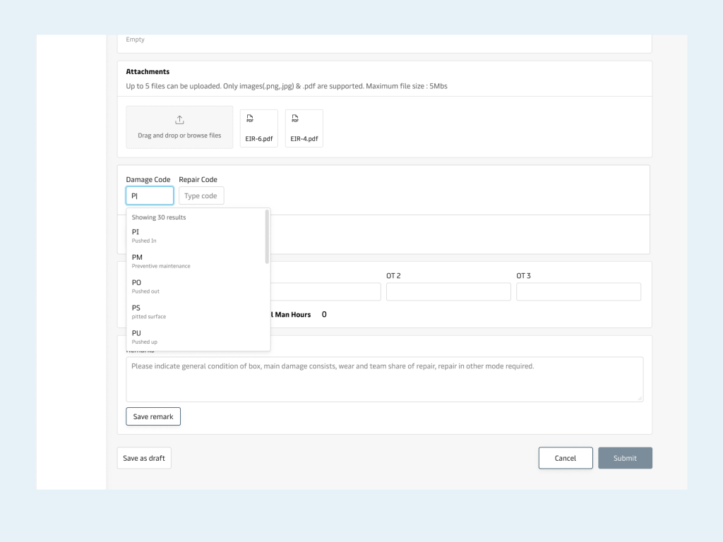 The repair process is divided into two steps; inspection & work order submission. The equipment inspectors inspect a container at the time of Gate-in and document the damages in a survey report. The inspectors would also captures images as proof of damage in an app called EIR. Another shop user is responsible to digitize these reports and create work orders using the legacy system.